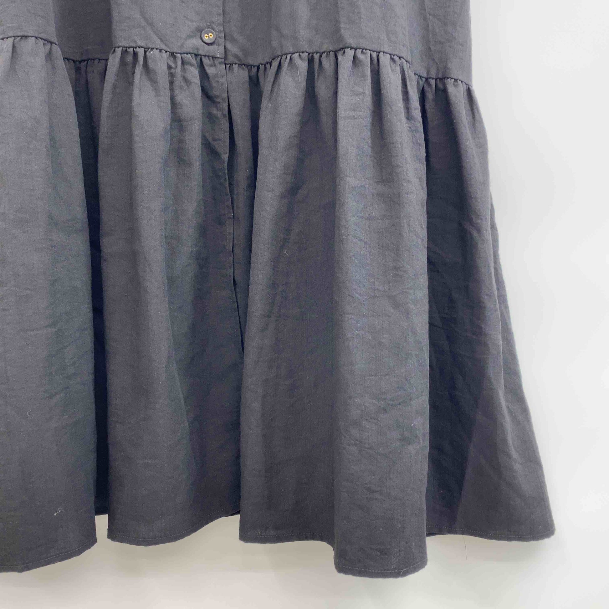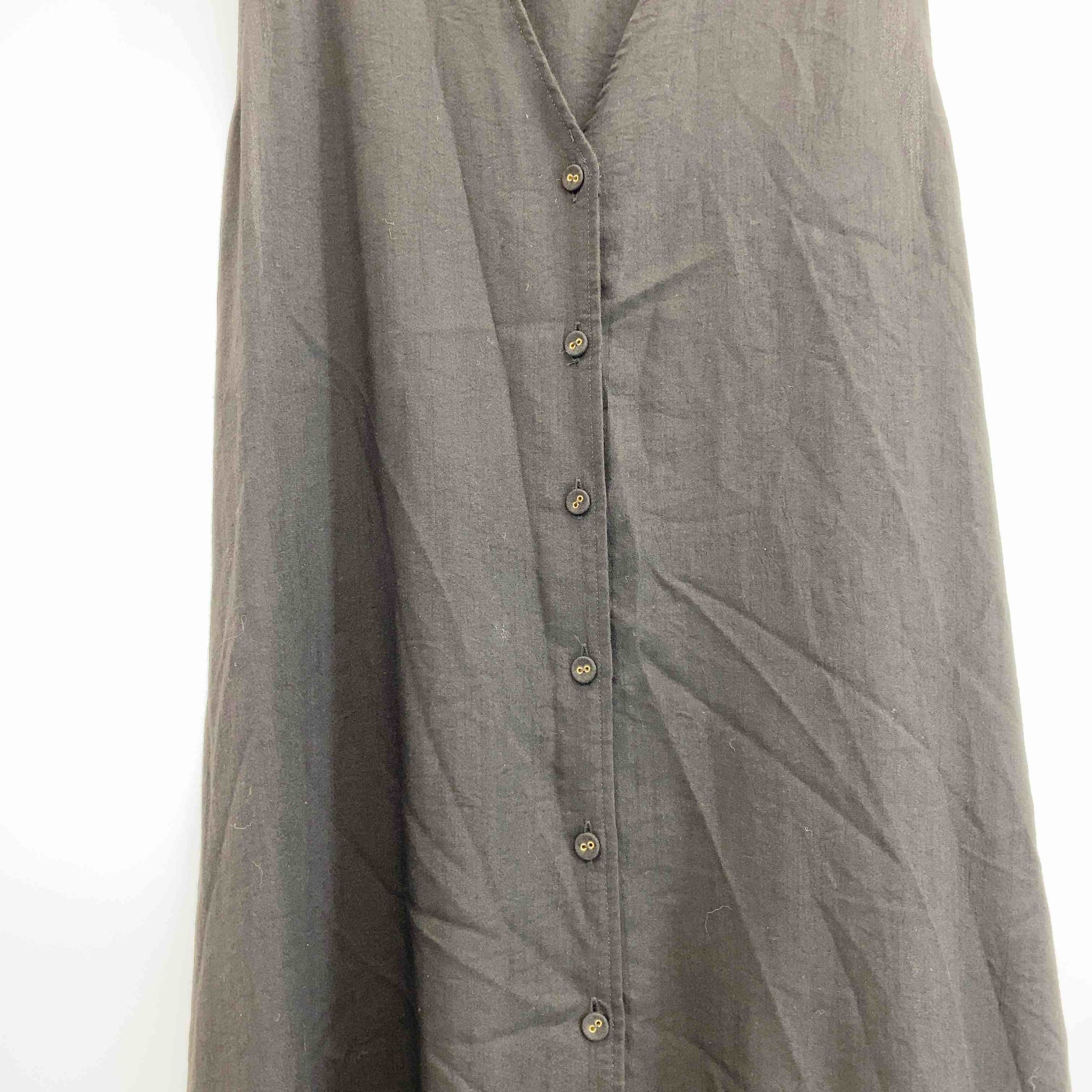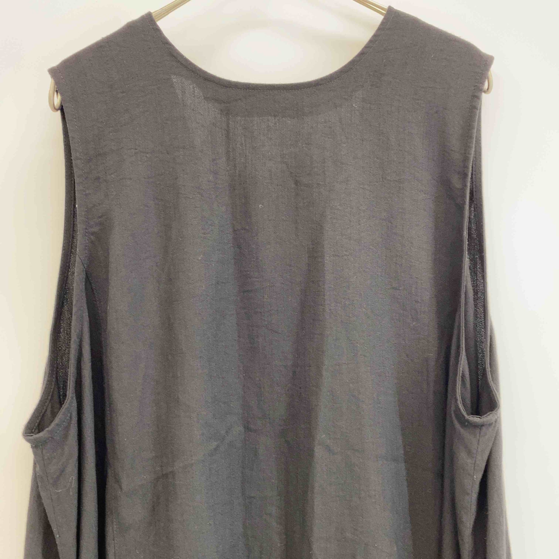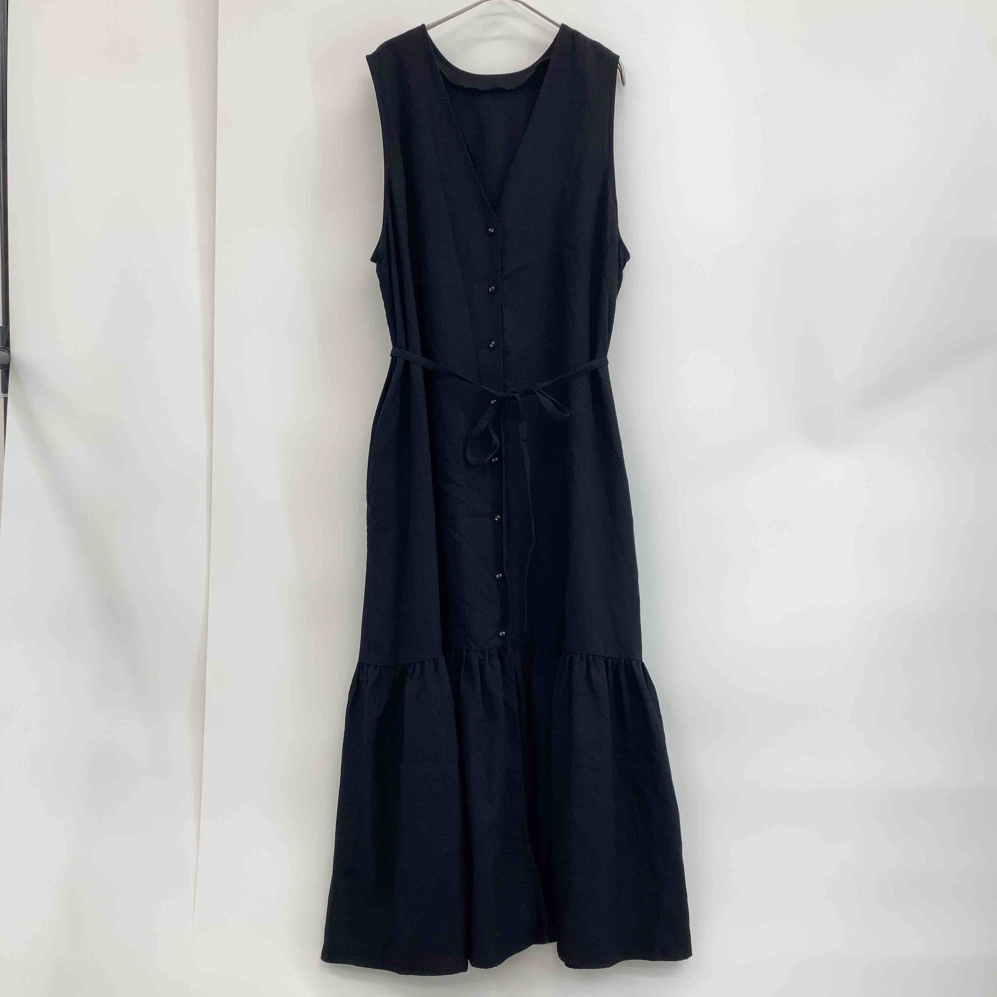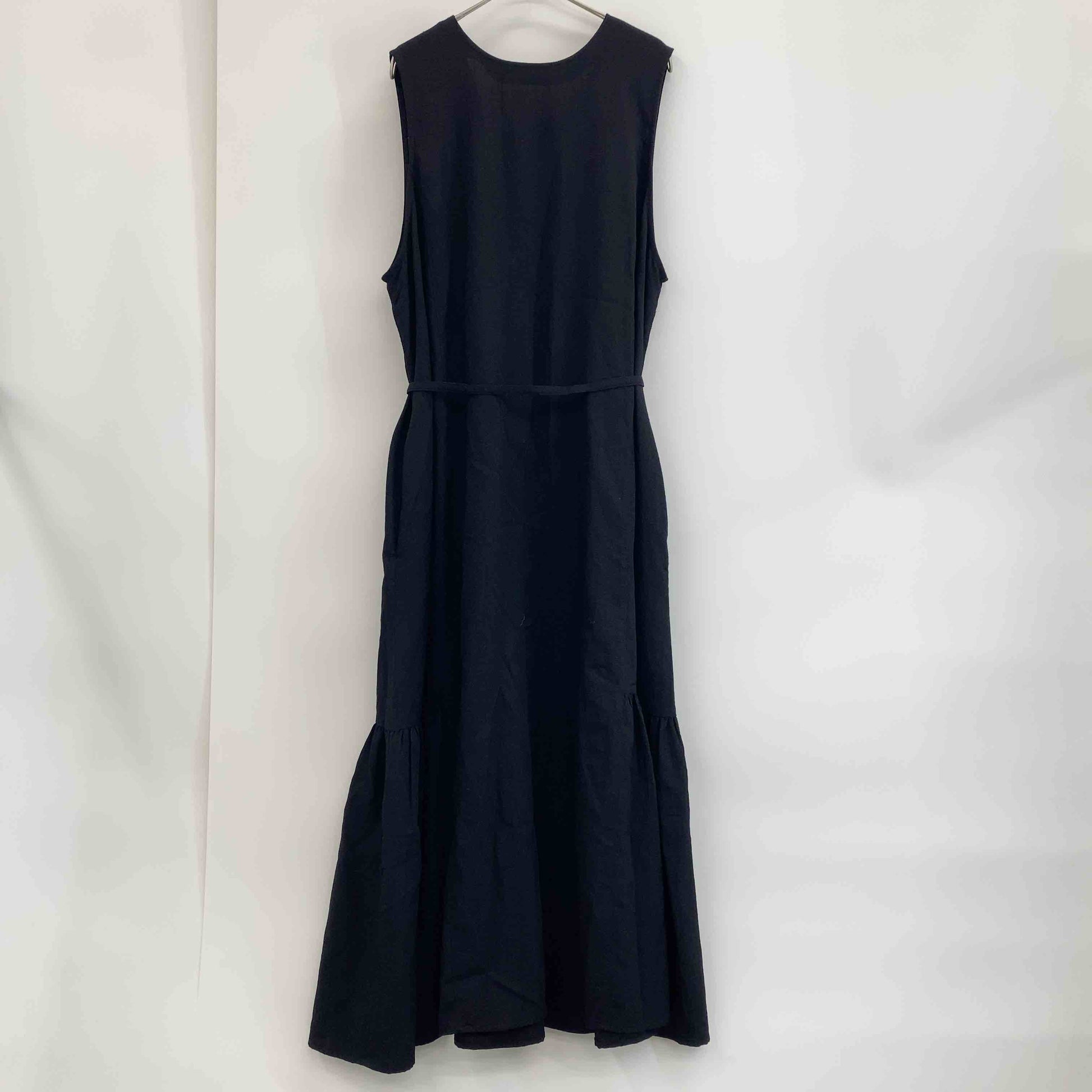 レディース ノースリーブワンピース ブラック 前開きワンピース ウエストリボン 麻調